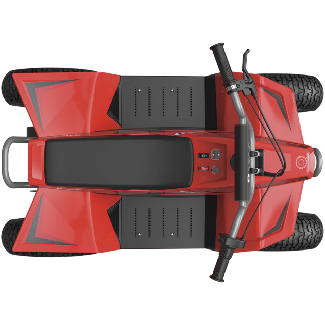 4-wheeler with 12-inch pneumatic tires, front brush bar, adjustable riser handlebars, and rear grab handle with space saving vertical storage capability.